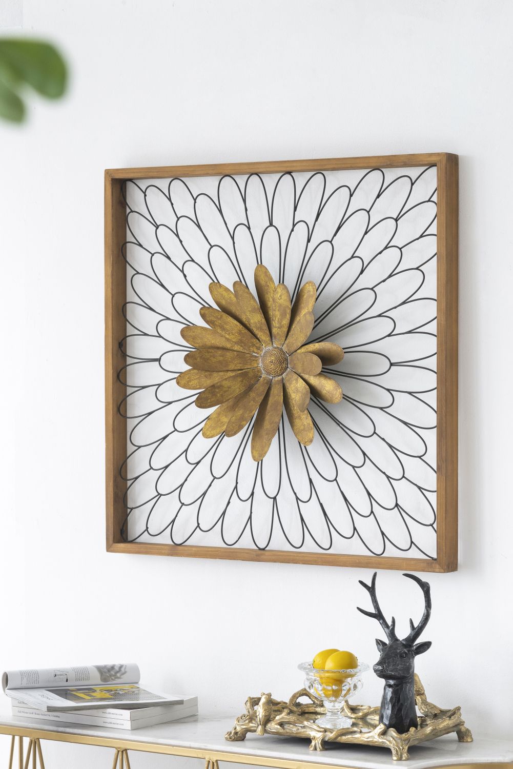 With its natural wood frame, wire petals, and gold center, the Ashlyn Bloom Wall Decor adds a charming floral touch to any space.