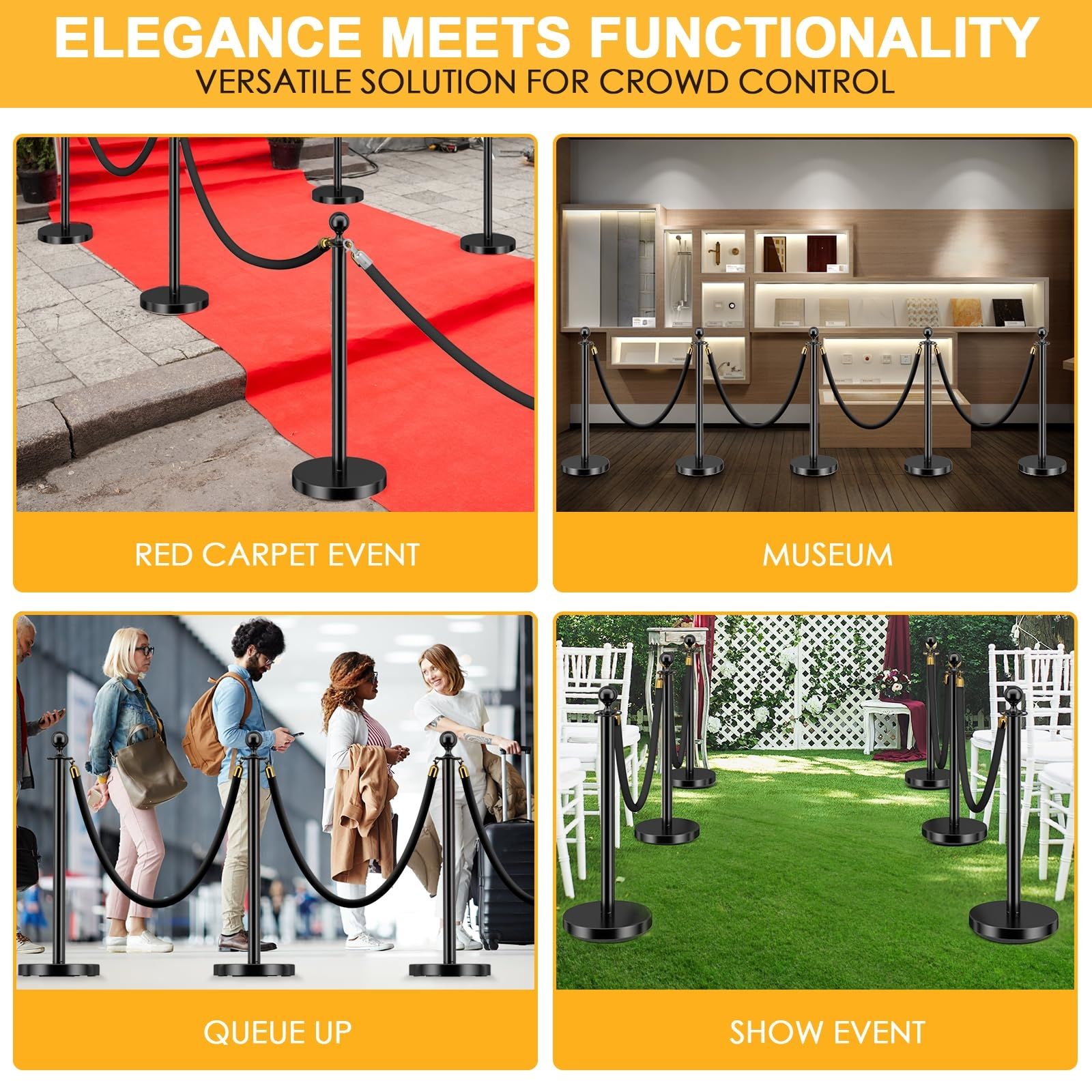 You will get: 4*Stanchions(37.4 in), 3*Ropes(5 feet/ 1.5 meters) with zinc alloy lobster clasps, stanchions and velvet ropes come in customised packaging to reduce the risk of product breakage and missing accessories, and All the things will be delivered at the same time, it will not delay your use.High quality materials: Black stanchion post are made stainless steel, ensuring waterproof and rustproof , the electroplating technology helps maintain a lasting luster for the product to adapt to indoor and outside. Black Velvet Ropes is made of flannel material, elegant and thick.Rubber Base: The rubber bases require the injection of sand to add weight, This will protect the floor and post.More importantly, making them sturdy enough to with stand strong winds and resistant to being pushed down by a crowd.Easy to Install: You can quickly and easily assemble stanchion post without any additional tools, Each post effortlessly screws into place, ensuring a hassle-free setup process, and each post has 4 adapters on top for attaching velvet ropes, and there are hooks at the ends of each rope.Any occasions: Rope safety barriers can be used to facilitate better customer flow, guide customers to their desired end point, and create an orderly queuing environment. Such as theaters, hotels, casinos, red carpet events, ticket offices etc.