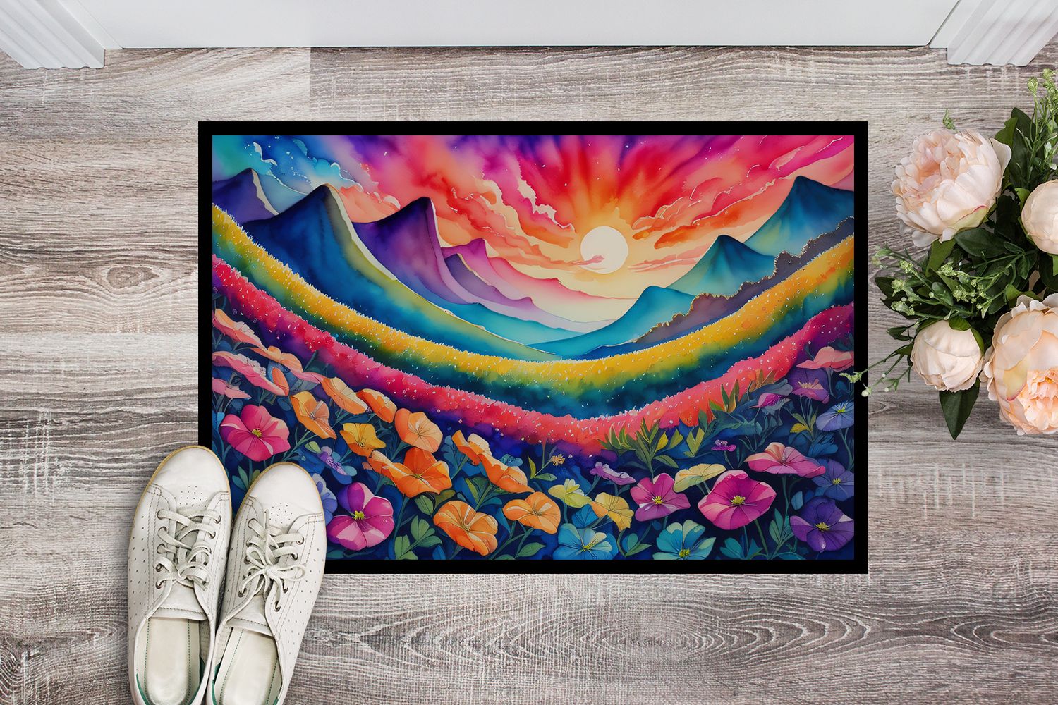 Welcome your guests in style with our Artwork Door Mat, designed to withstand almost any weather condition. This mat, measuring approximately 18 by 27 inches, is held together by durable black binding tape. Its top layer, composed of polyester felt, is dyed with the eye-catching image you see on the mat. A few layers below provide the mat with stability, while its rubber bottom is stamped to help prevent slipping and ensures safety. Our mat works wonderfully as both an indoor or outdoor door mat. For cleaning, simply hose it off with water or use a power washer - no need for any cleaner that produces suds. Avoid scrubbing with a brush, instead, opt for the vacuum on floor setting. Designed manufactured and printed in the USA, this mat is a perfect addition to your porch, outdoor kitchen, entryway, or any indoor space. Its unique design makes it a charming decorative rug that greets your guests and adds a stylish touch to your home decor.