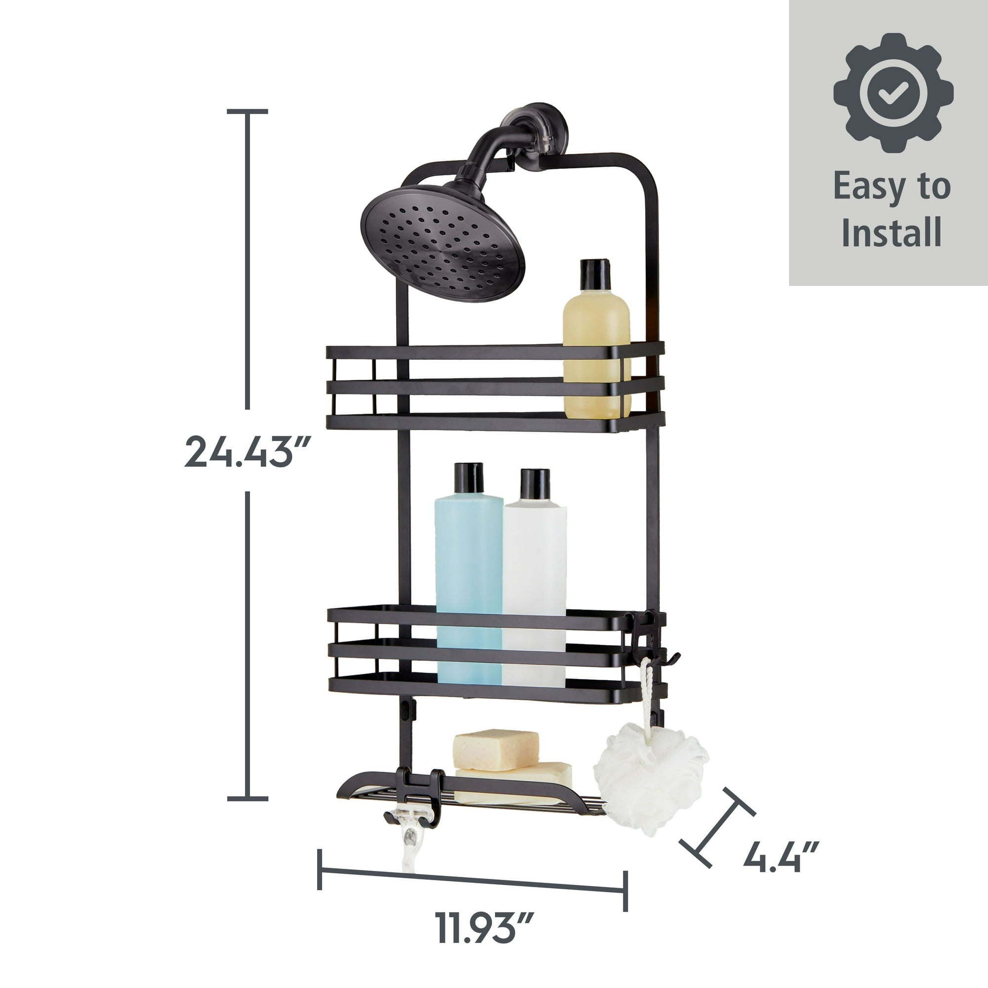 This easy-to-install Better Homes & Gardens Shower Caddy offers an accessible and organized storage solution for any cluttered shower space. The 2-shelf hanging caddy slips over any standard showerhead. Its exclusive Lock Top mechanism ensures easy, tool-free installation and a secure hold, with no slipping, swaying or sliding. The rust-resistant metal caddy can easily hold large bottles. For in-the-shower convenience, inverted bottle storage is built into its shelves for quick dispensing of shampoo, conditioner and more. A soap tray with hooks for razors and hanging storage adds to the caddy's versatility.