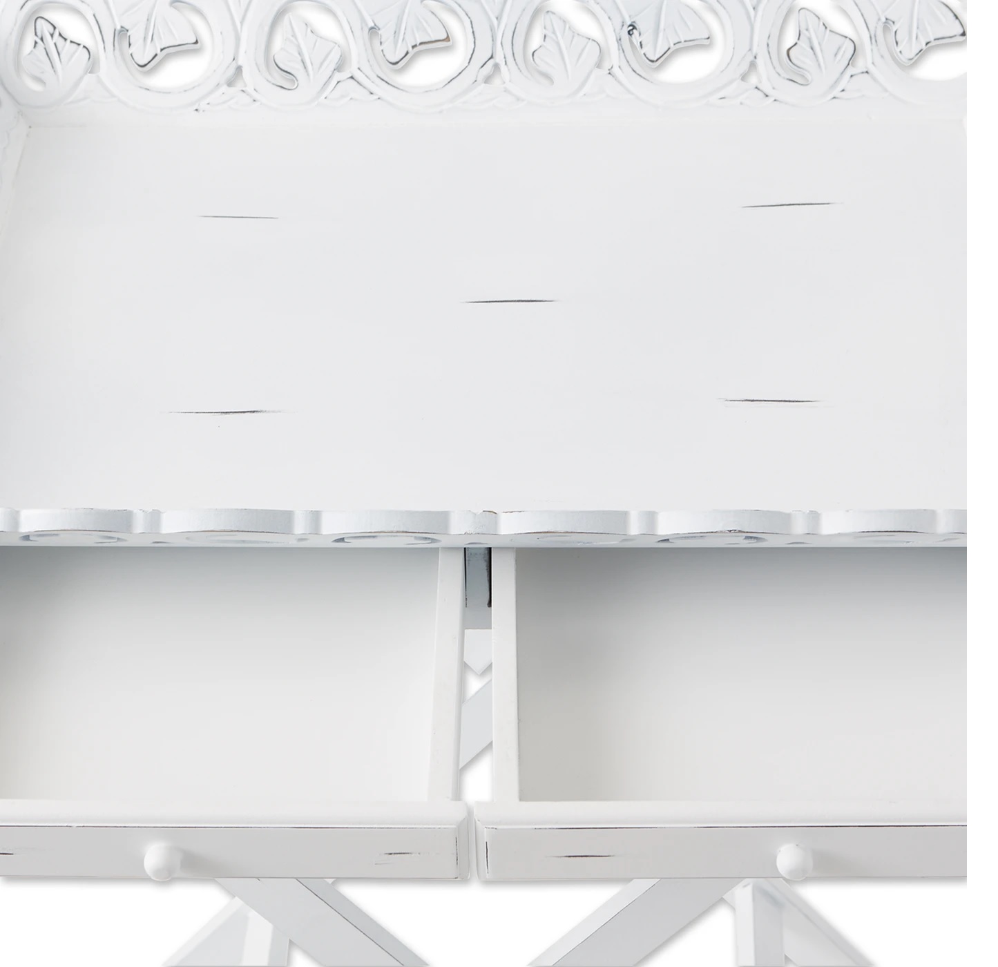 • Gracious entertaining is a snap with this stylish tray table! Elegantly aged white finish with a carved rim and two handy drawers; folding legs for easy storage.