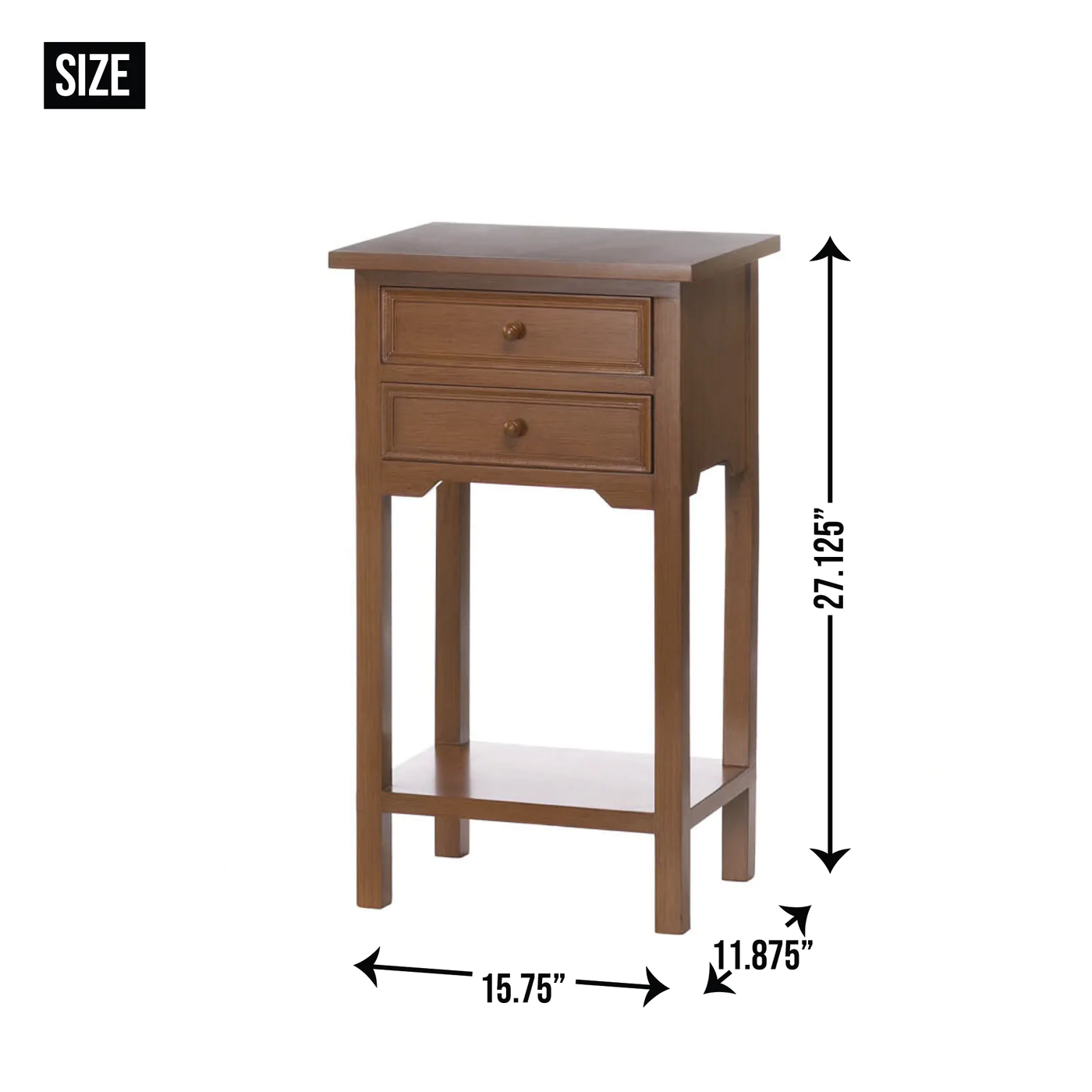 • This simply elegant design features two pullout drawers and a lower shelf that's perfect for a pretty display or extra storage. Nestle it next to your sofa, your bedside or anywhere you need a touch of classic style. This wood table has a rich brown finish and two drawers that feature stylishly simple pulls. Maximum weight limit: 25 lbs.