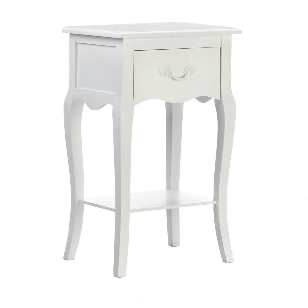 • This romantic country nightstand fits nicely anywhere, whether it's tucked next to your bed, or in the children's room. Featuring one drawer and a lower open shelf, this table's white finish makes a timeless addition to your space.