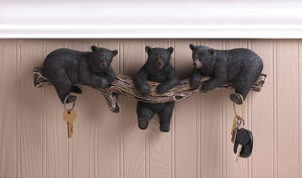 • Get a leg up on organizing with this charming trio of bears! Three black bears are lounging on a log, each sticking out a foot that can be used as a hook. Great in the bathroom or kitchen.