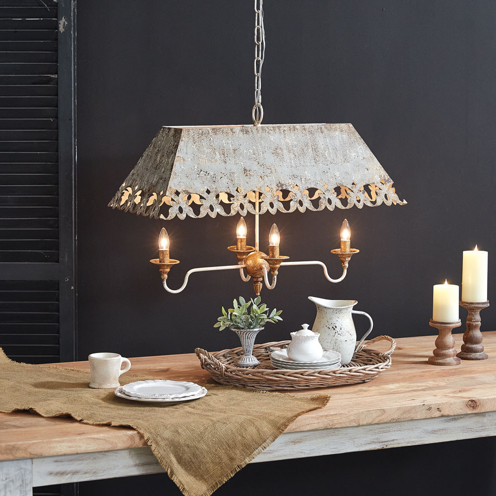 Crafted to resemble beautiful French awnings, our Quimby Dining Room Pendant curates a sense of regality and elegance. This pendant lamp is designed to be hardwired: no plug is included. This lamp hangs a total of 55''H from the canopy to the end of the lamp. Includes a matching canopy and chain. Requires four candelabra base light bulbs, not included.